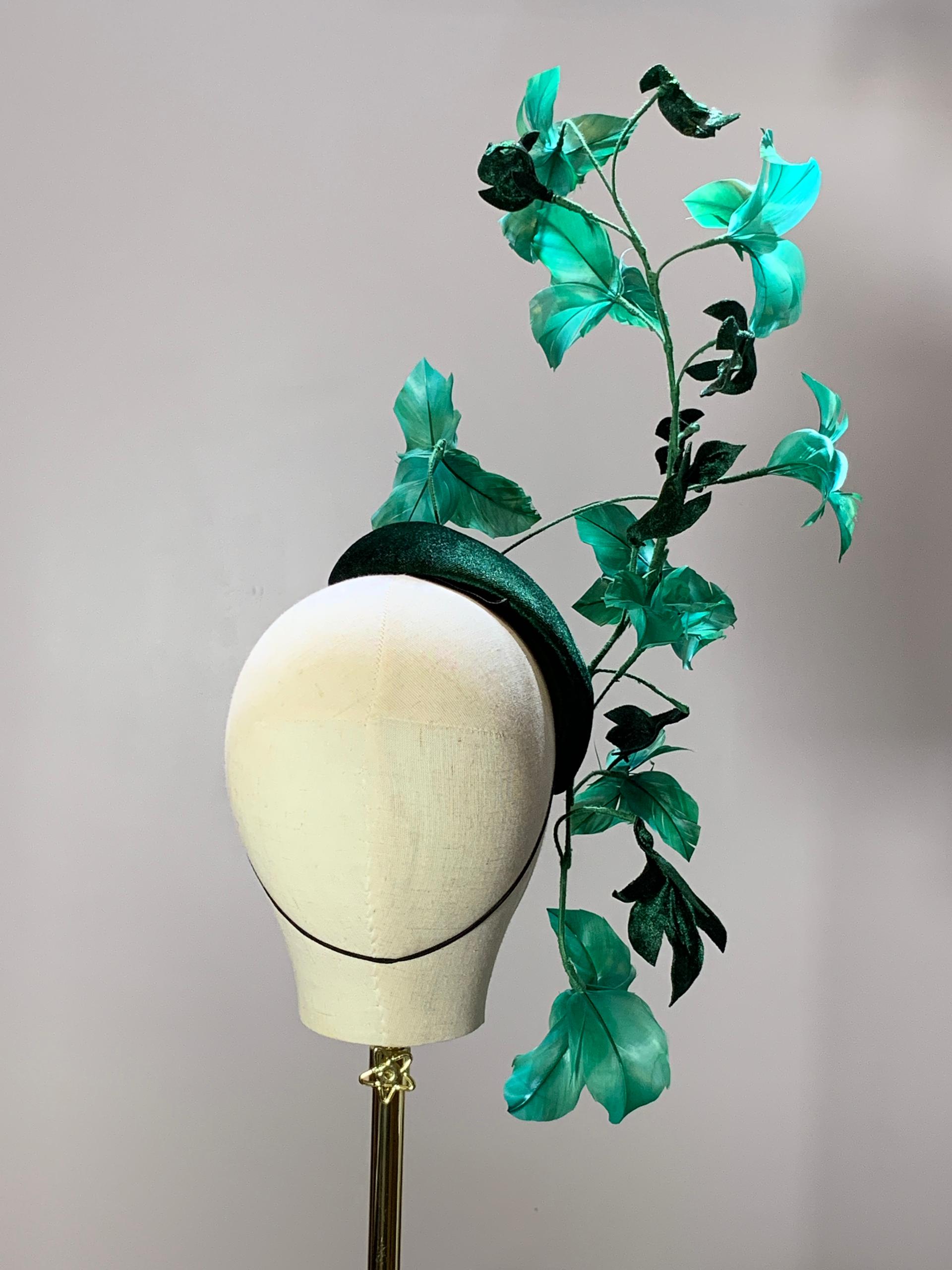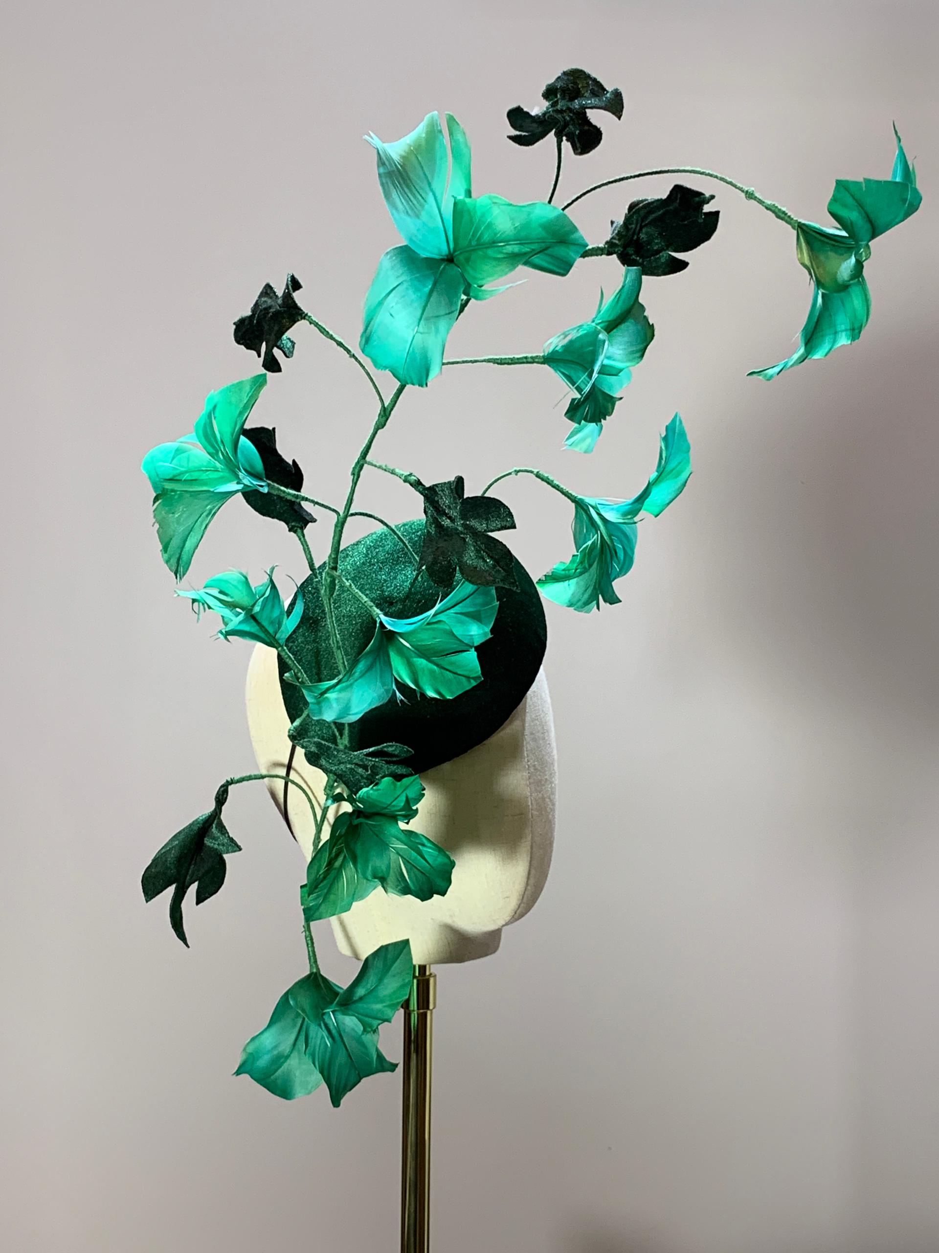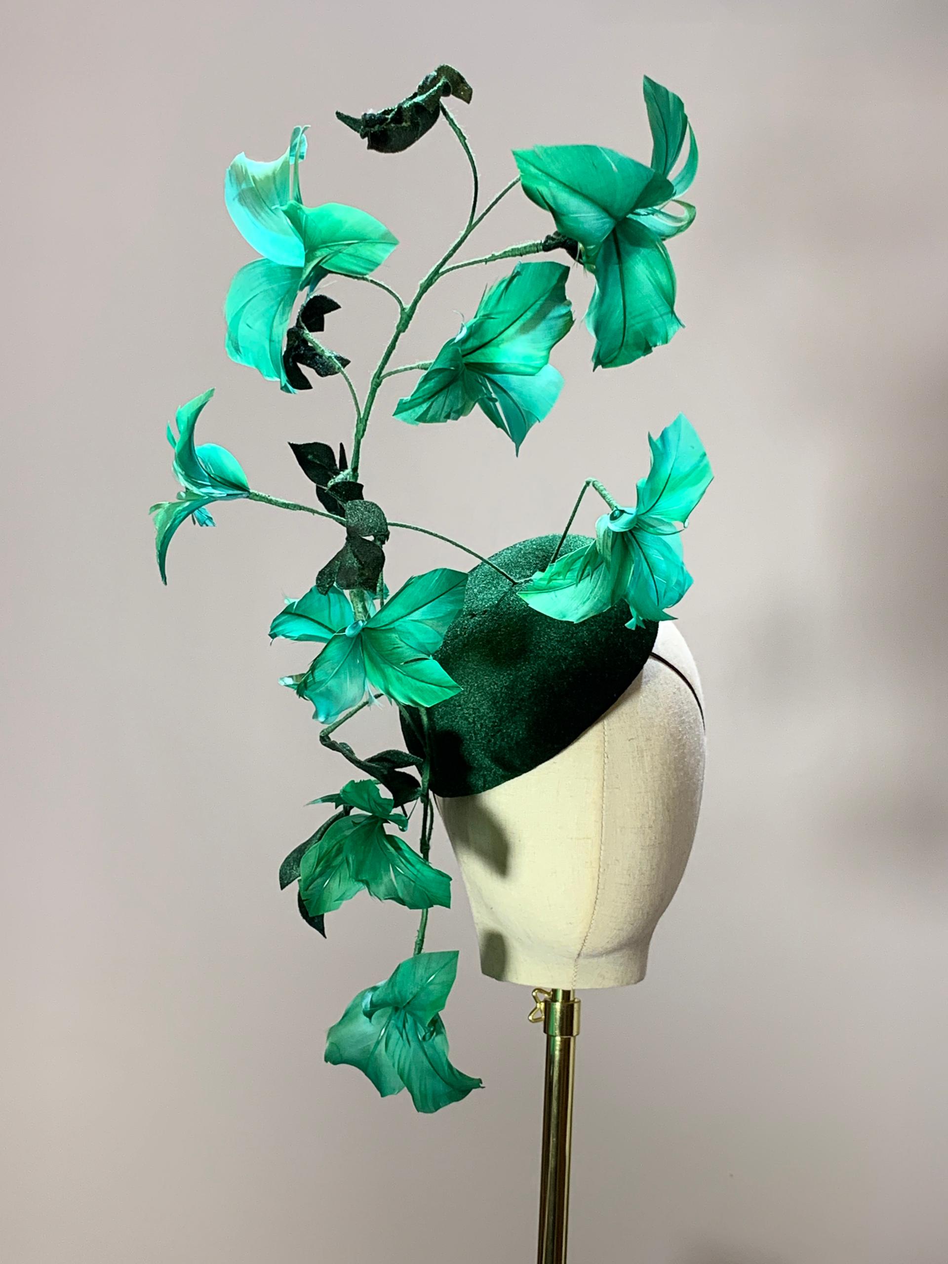 Description: A botanical fascinator of sculpted green foliage and bloom, representing nature’s continuous growth and emotion.