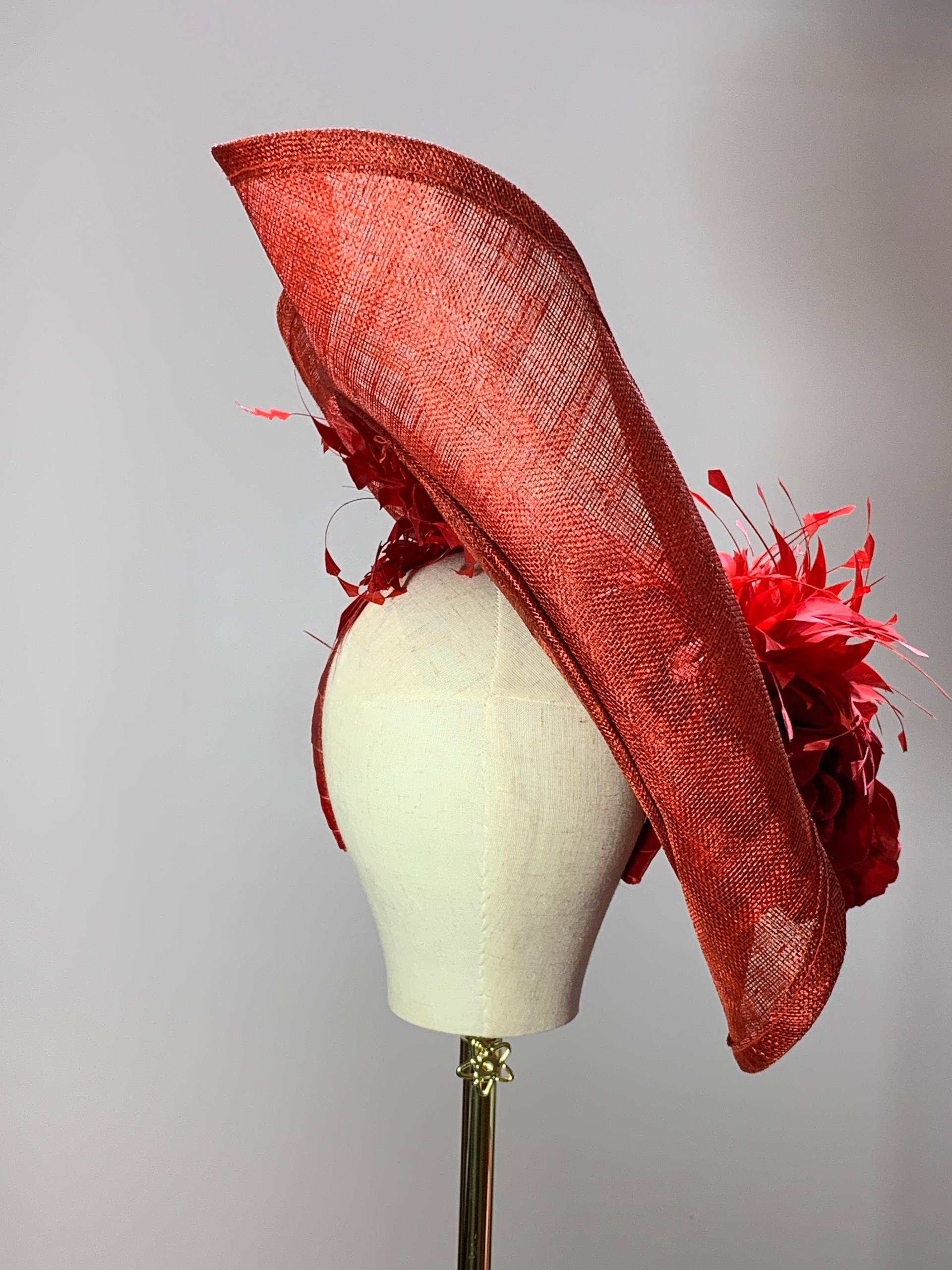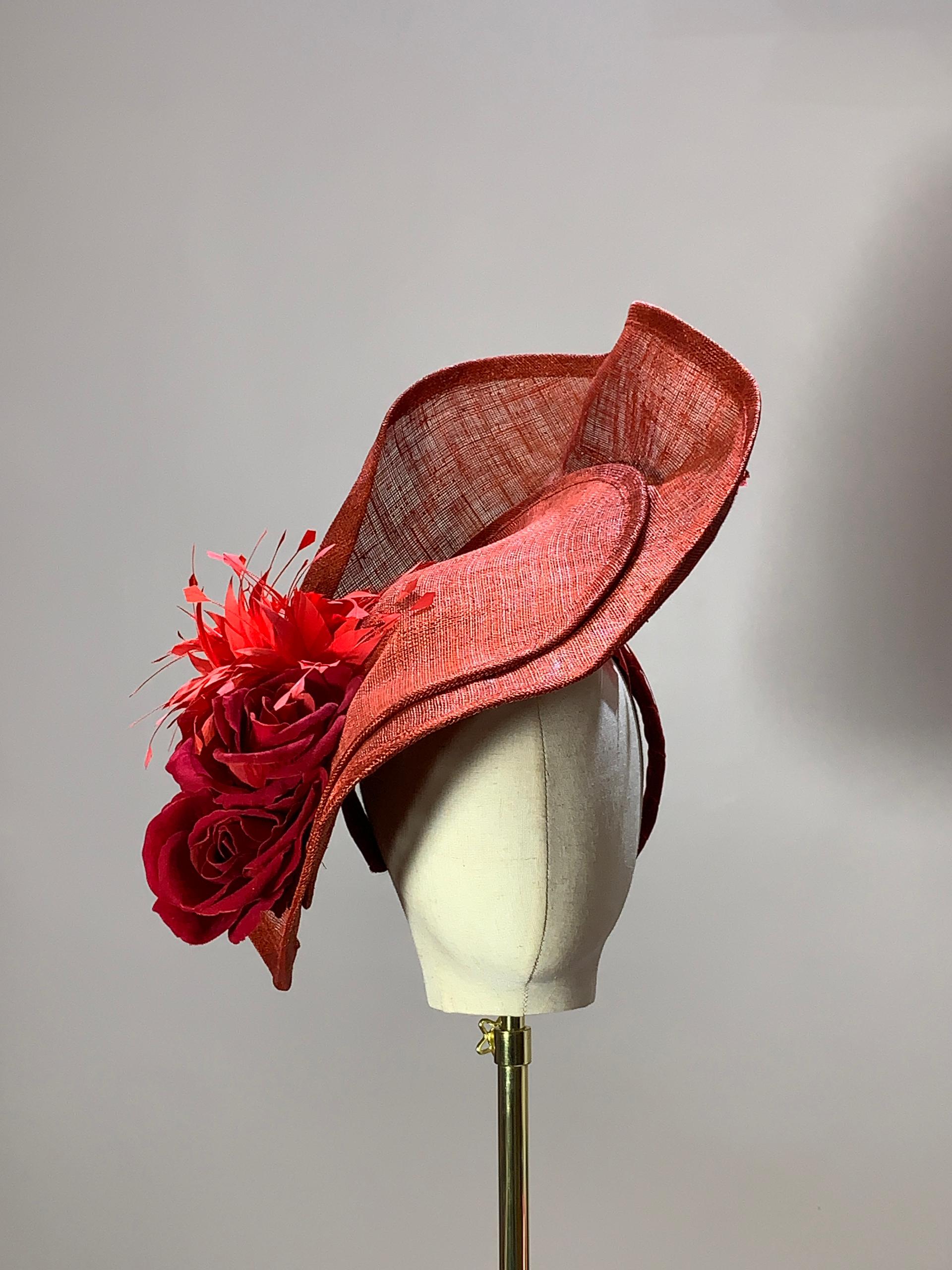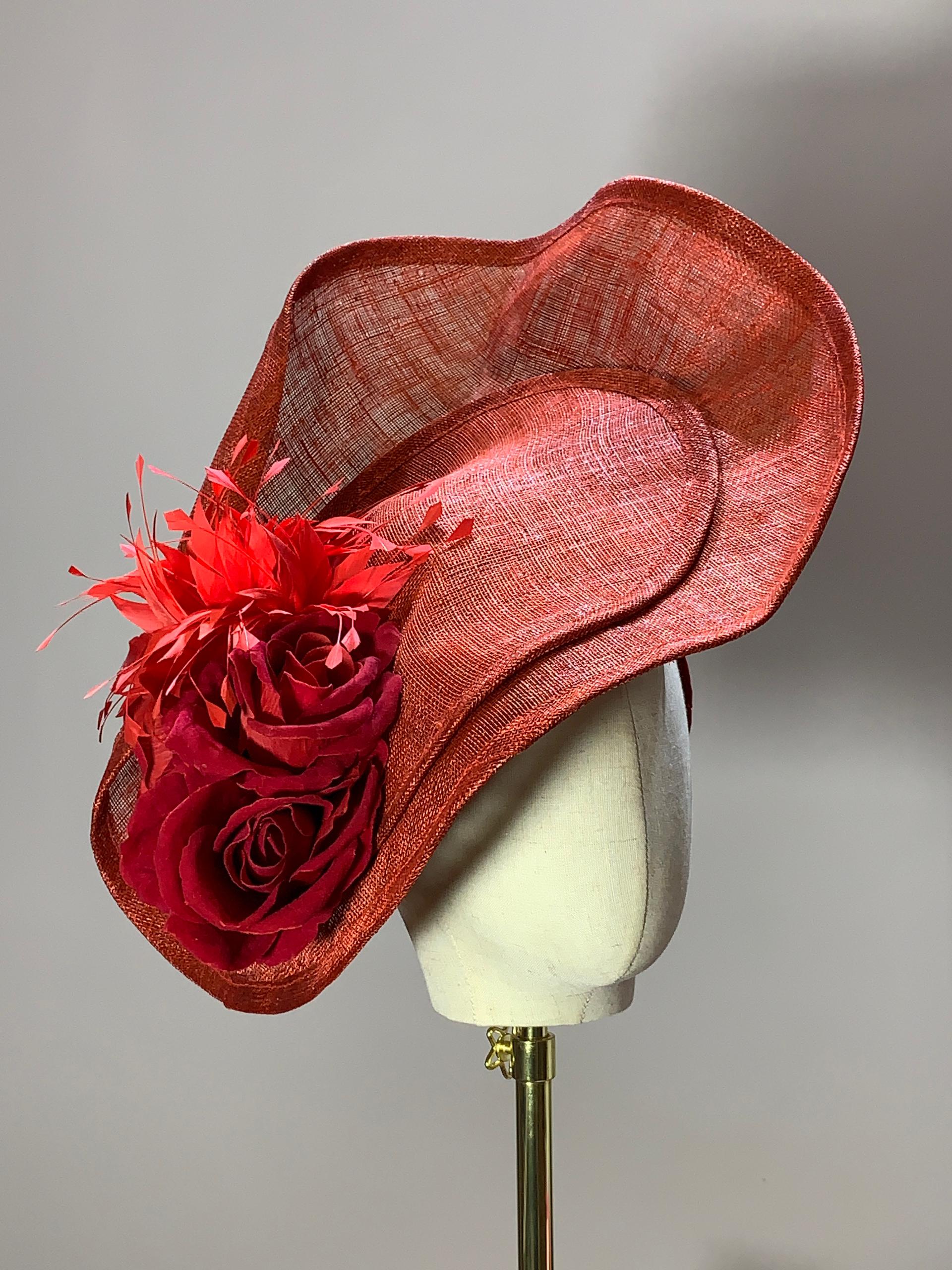A sculptural red statement hat featuring undulating sinamay waves adorned with lush roses and feathers. The Goodness is the epitome of bold grace and timeless couture drama.