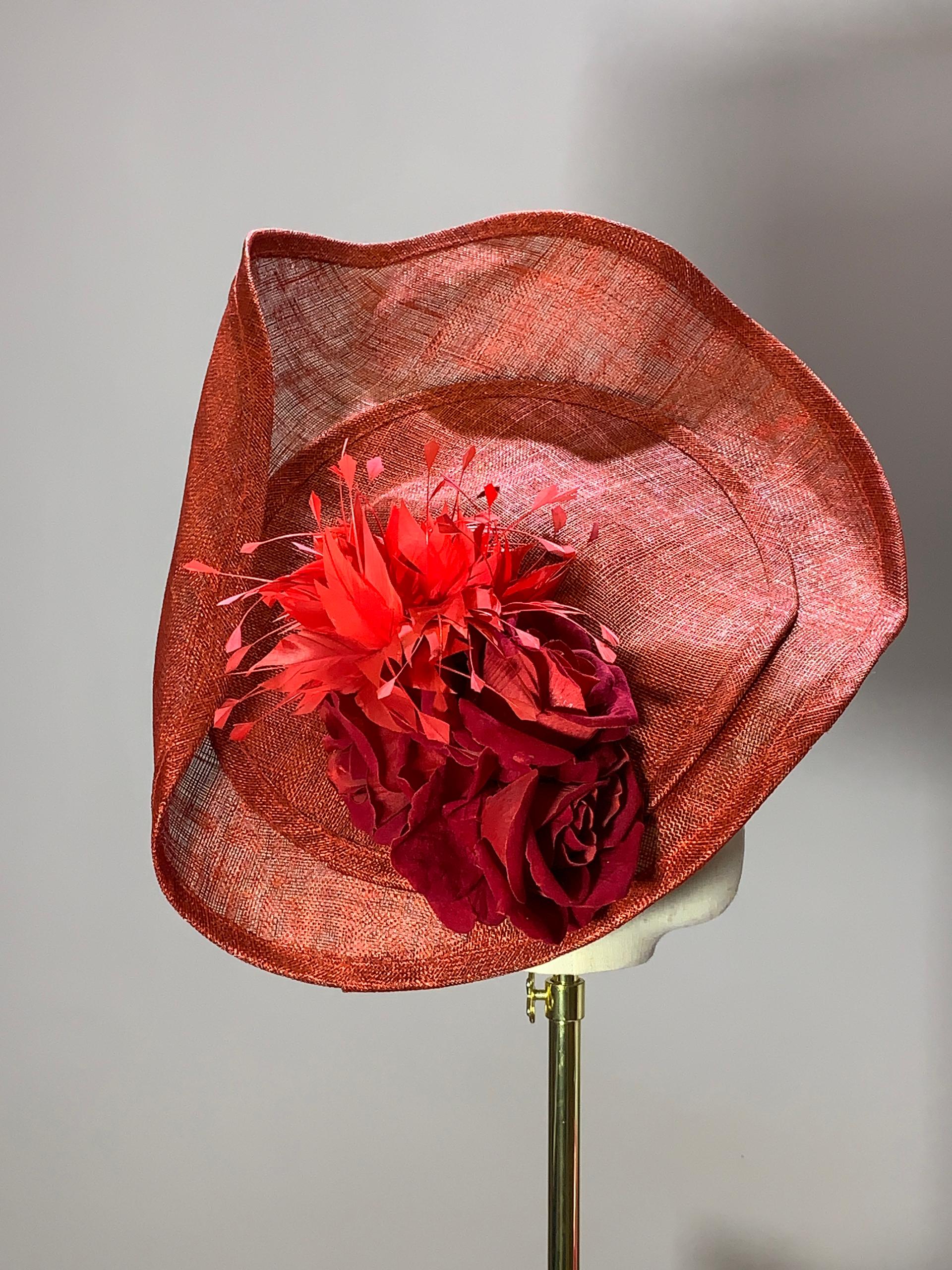 Materials: Hand-shaped sinamay, silk roses, dyed feathers, millinery wire.