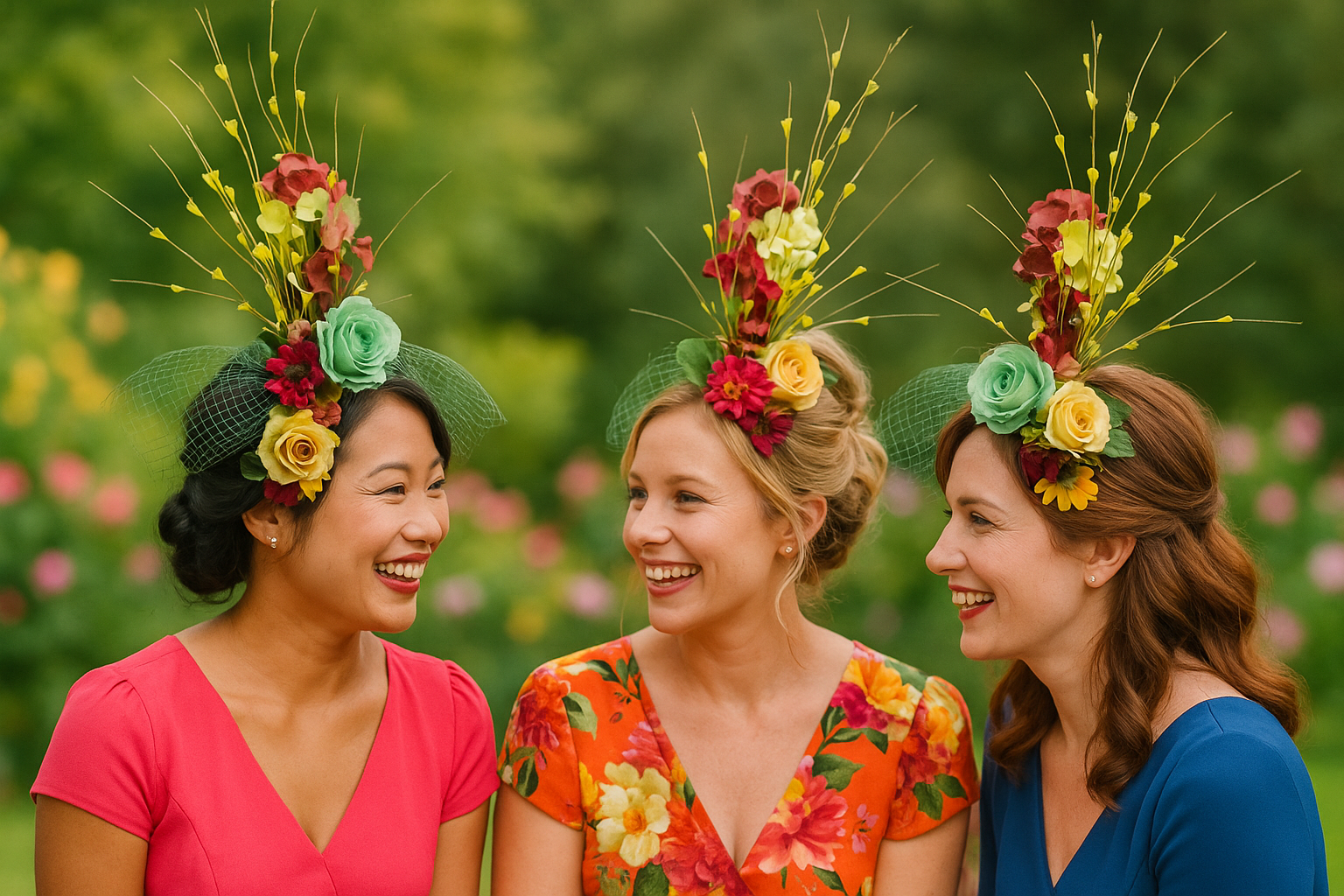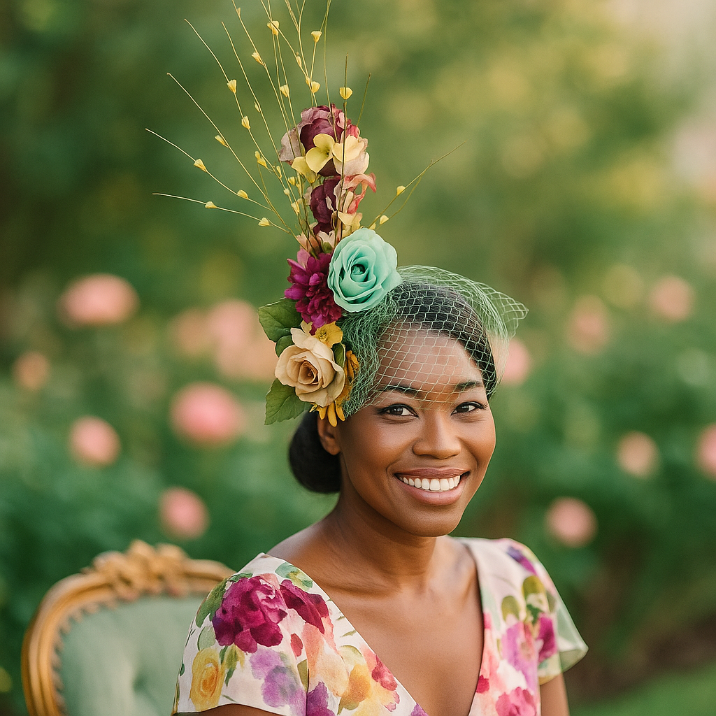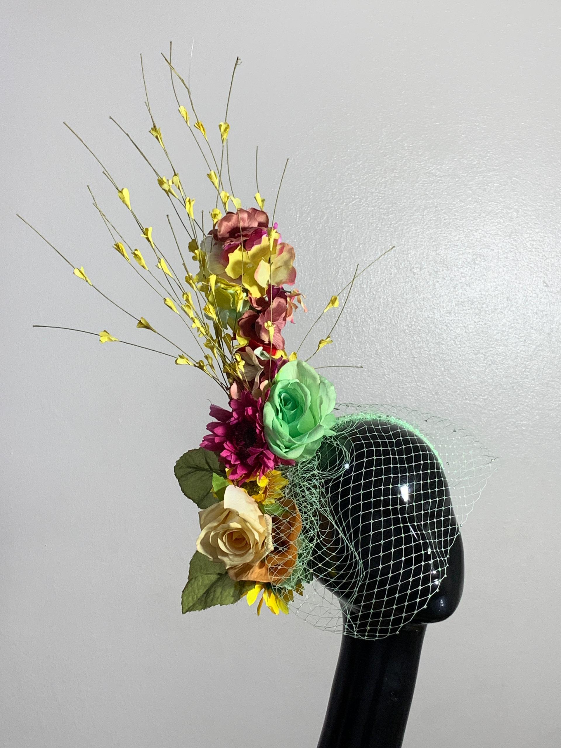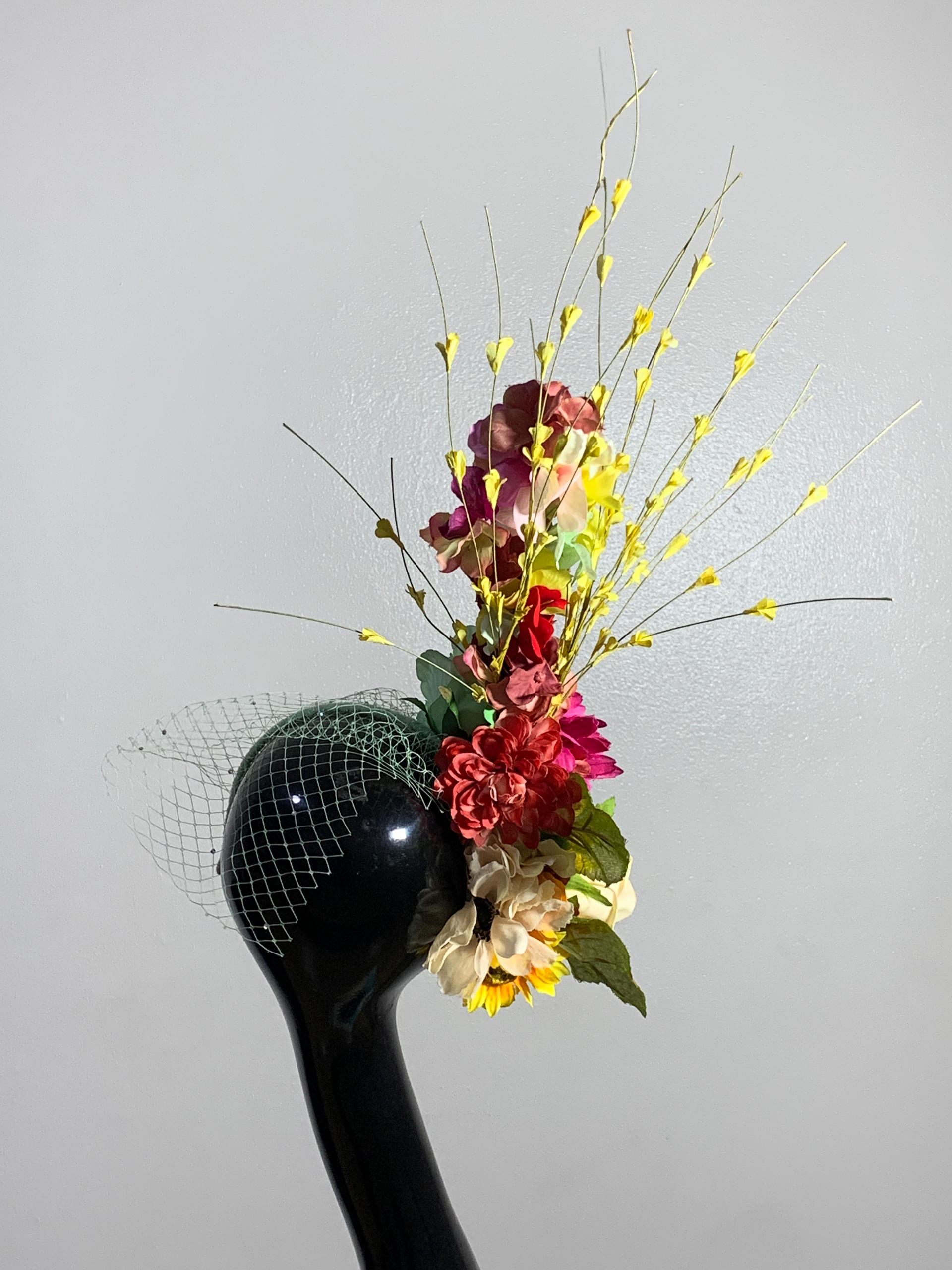 Description: A tall, blooming fascinator featuring a colourful mix of handcrafted flowers and golden shoots, celebrating vibrant elegance and the spirit of rebirth.